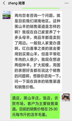 王师傅好,再向您老咨询一个问题,就是目前我们湖南地区。这种黑山羊销售市场、渠道及价格是怎样的啊?我现在自己家里养了十多头母羊,商品羊都是卖到了周边。一般别人家里办酒啊,红白喜事之类的就会要用到买黑山羊,但是平常吃羊肉的人很少,我现在想进两组种羊,扩大规模,周围的亲朋好友都在说这个销售的问题啊,想跟你咨询一下,问一下现在具体的销售市场、渠道和销售价格。