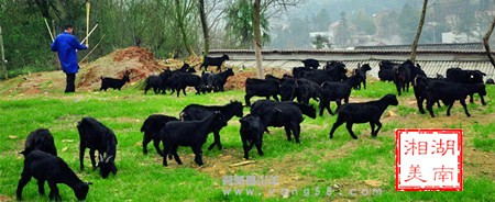 湘美品种羊,100%乌黑的毛色,又短又亮又柔顺,明亮的双眸,健壮的身躯,欢快的在山地上吃着嫩草,如下图: